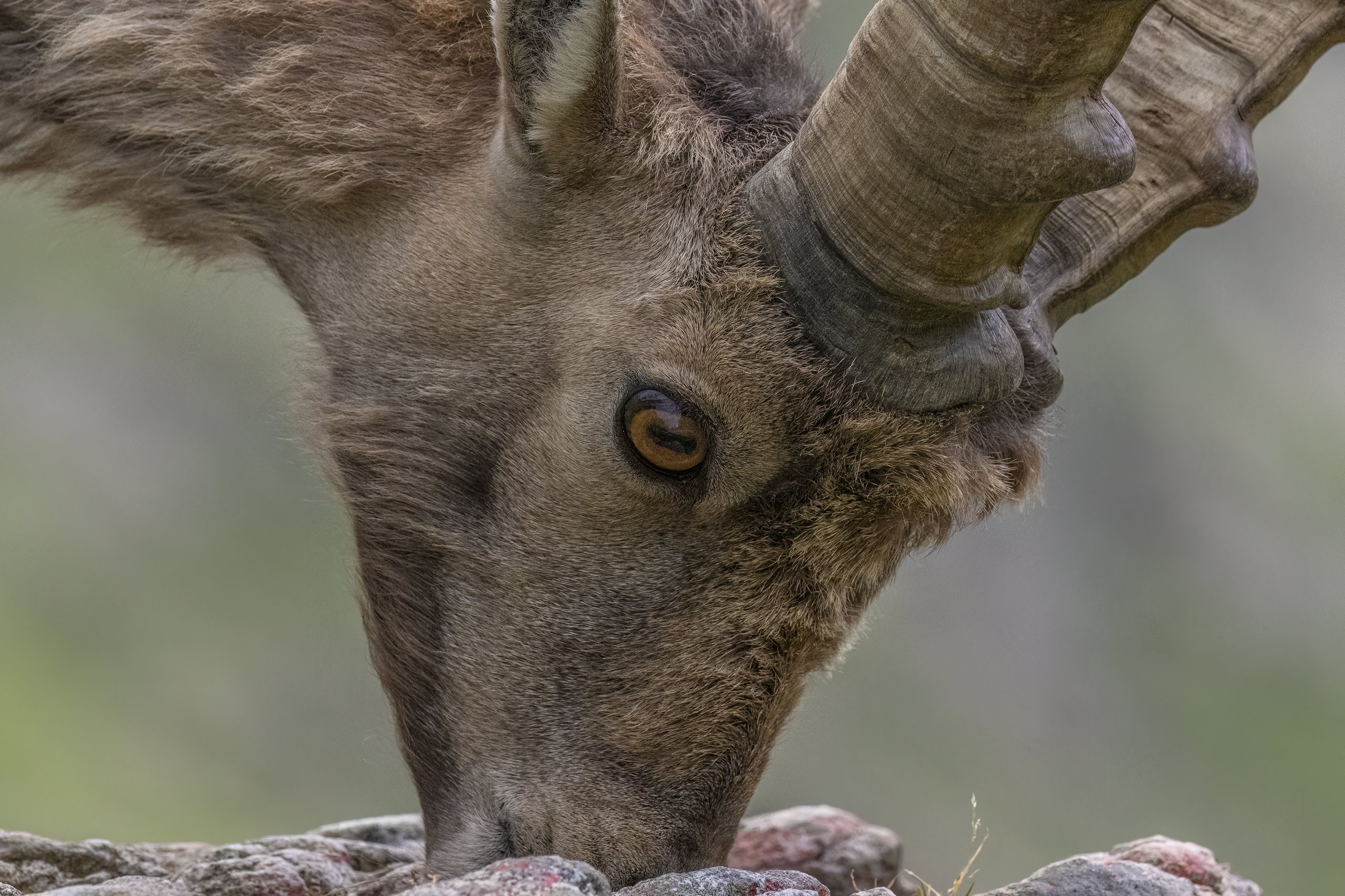 Majestätischer Alpensteinbock in seinem natürlichen Lebensraum in den Schweizer Alpen. Die kraftvolle Erscheinung und die imposanten Hörner machen dieses Tier zu einem faszinierenden Motiv der alpinen Tierwelt.