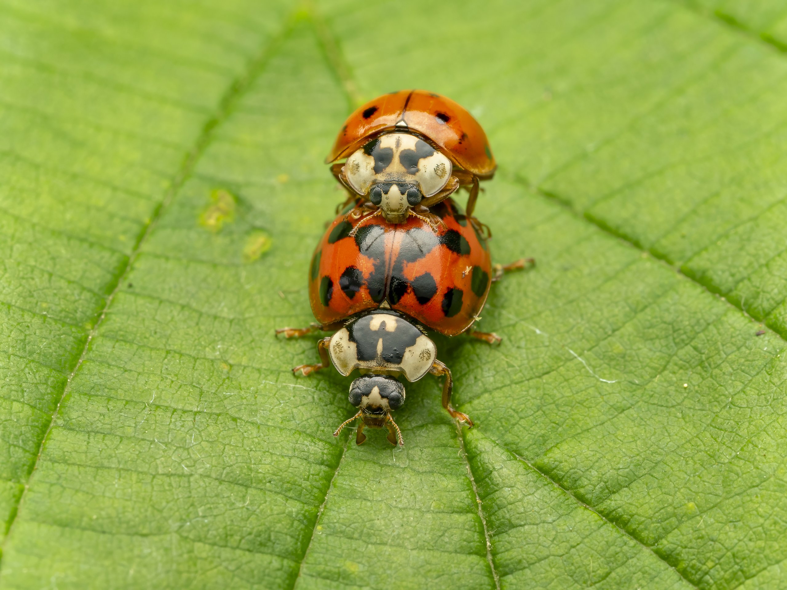 Asiatischer Marienkäfer in beeindruckender Nahaufnahme. Die leuchtend rote Färbung und die feinen Strukturen des Panzers werden in dieser Macro-Aufnahme eindrucksvoll sichtbar.