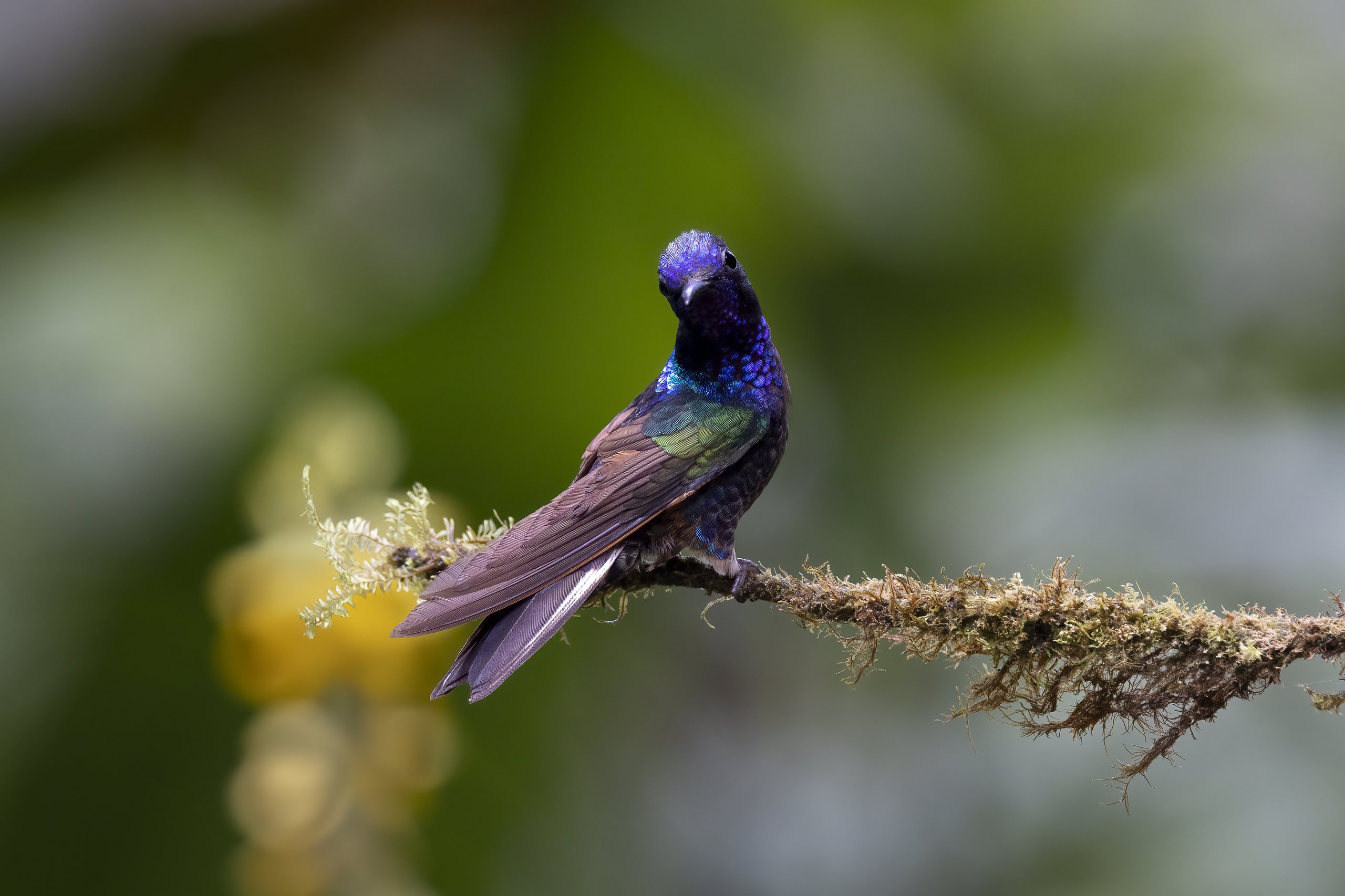 Der Velvet-purple Coronet – ein Kolibri von atemberaubender Schönheit aus den Bergnebelwäldern Ecuadors. Die samtigen, purpurfarbenen Federn geben diesem Vogel seinen passenden Namen.