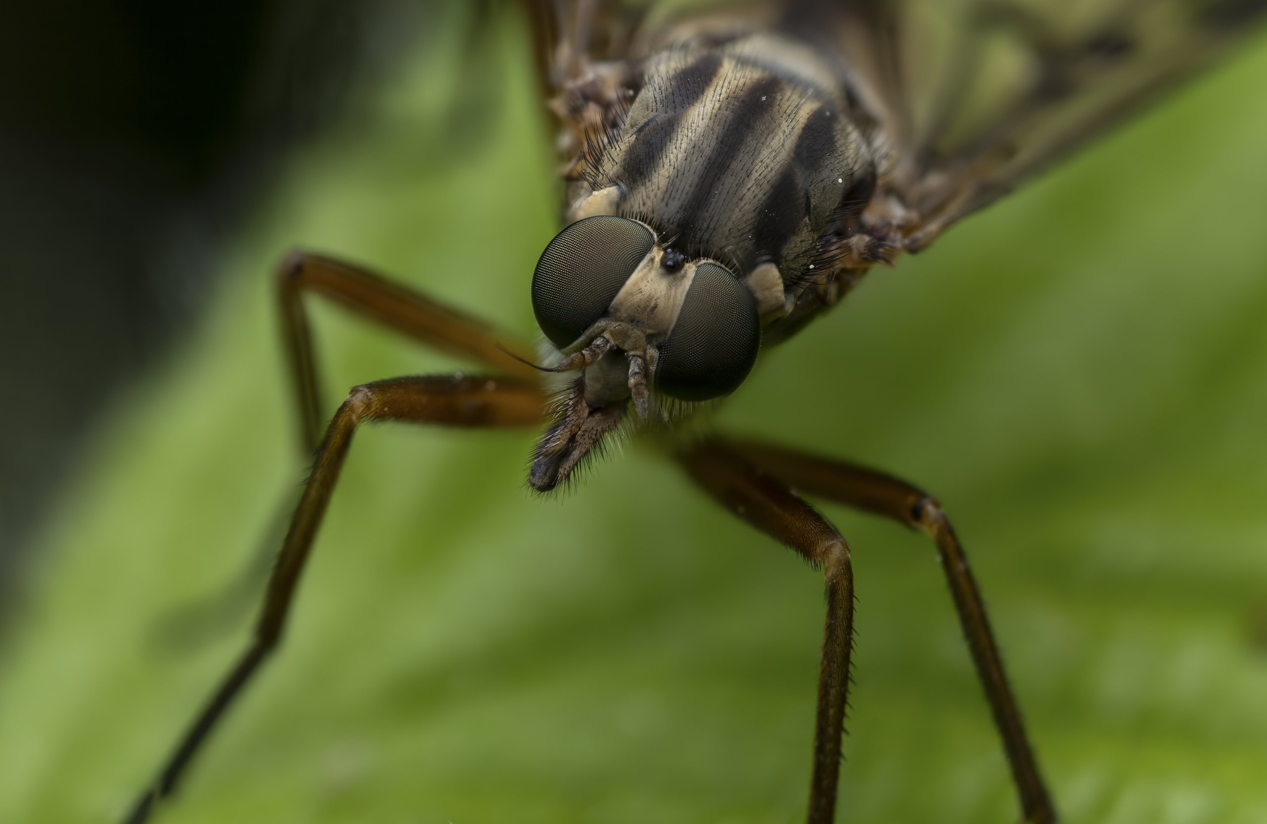 Eine Schnepfenfliege, eingefangen in einer detailreichen Nahaufnahme. Die filigranen Flügel und der schlanke Körperbau machen diese weniger bekannte Fliegenart zu einem ästhetischen Macro-Motiv.