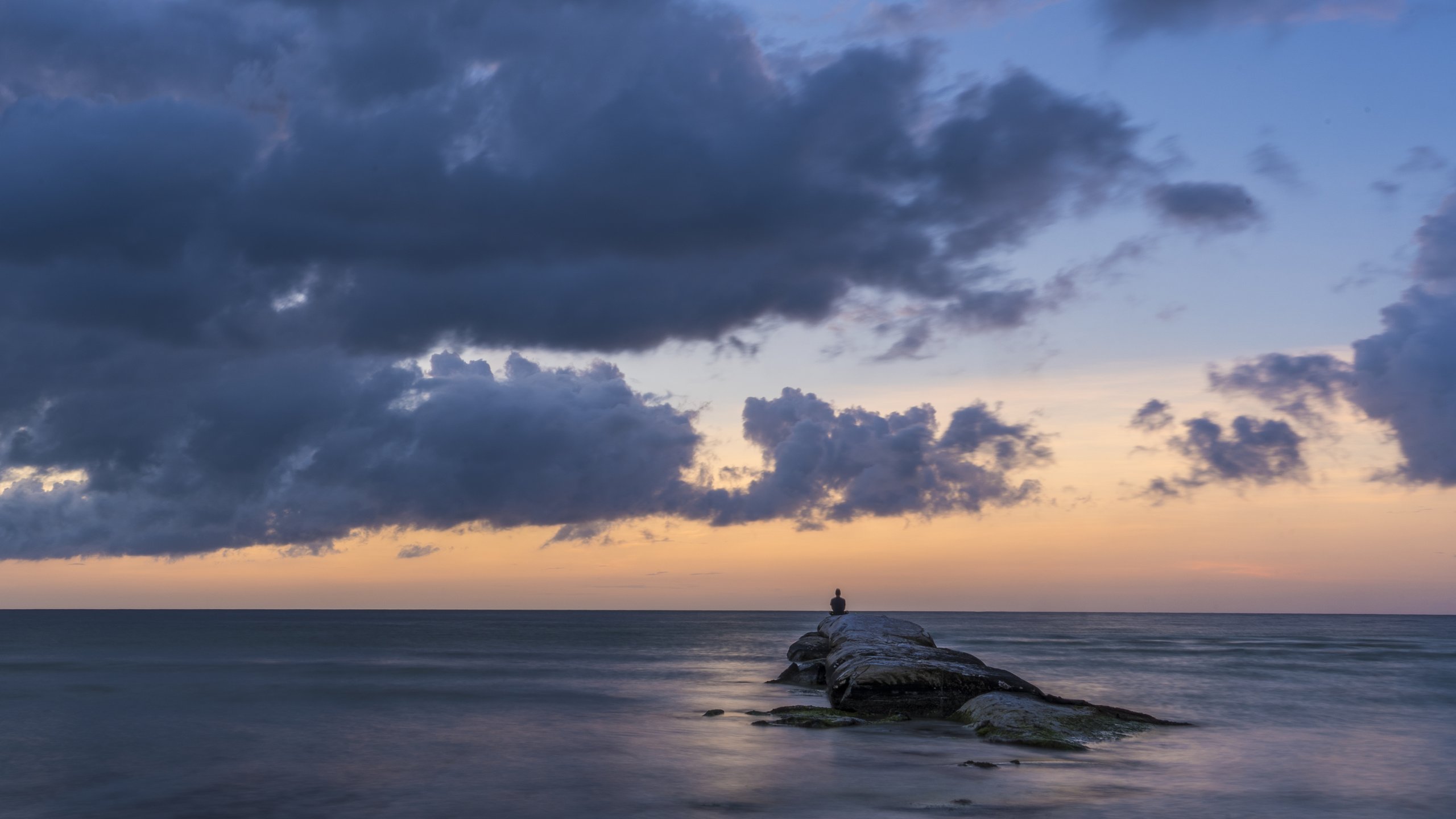 Ein einsamer Mann auf einem Felsen vor dem weiten Meer auf Isla Holbox, Mexiko. Eine kontemplative Szene, die Ruhe und die Verbundenheit mit der Natur ausstrahlt.