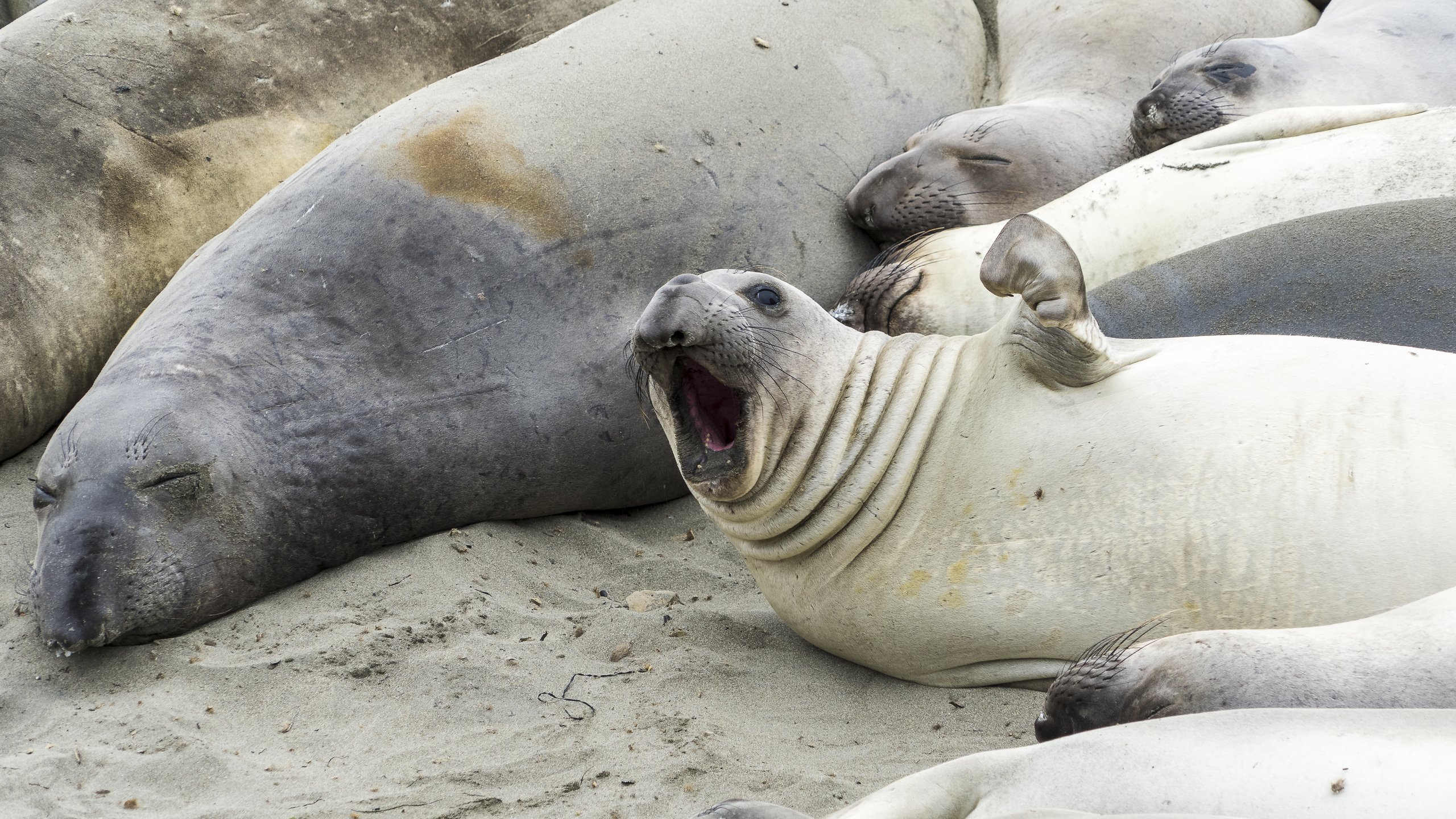 See-Elefanten in ihrer natürlichen Umgebung. Diese massigen Meeressäuger beeindrucken durch ihre schiere Grösse und ihre gemächliche Art – ein faszinierender Einblick in das Leben an der Küste.