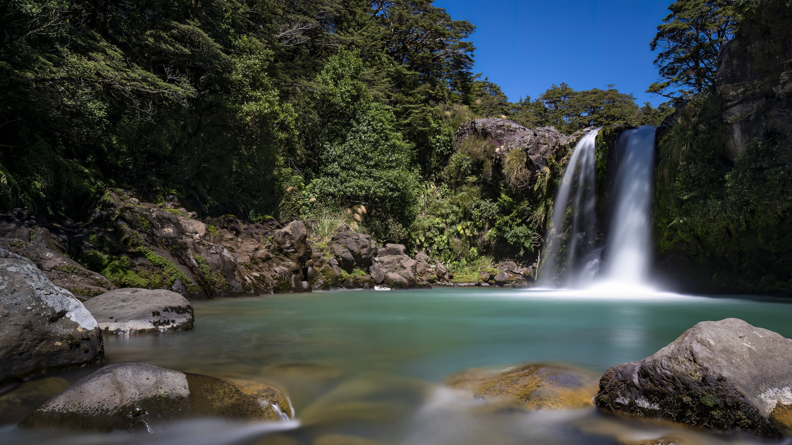 Die Tawhai Falls in Neuseeland – ein malerischer Wasserfall, eingebettet in dichten, moosbewachsenen Regenwald. Das fallende Wasser und die üppige Vegetation erzeugen eine Atmosphäre purer Naturschönheit.