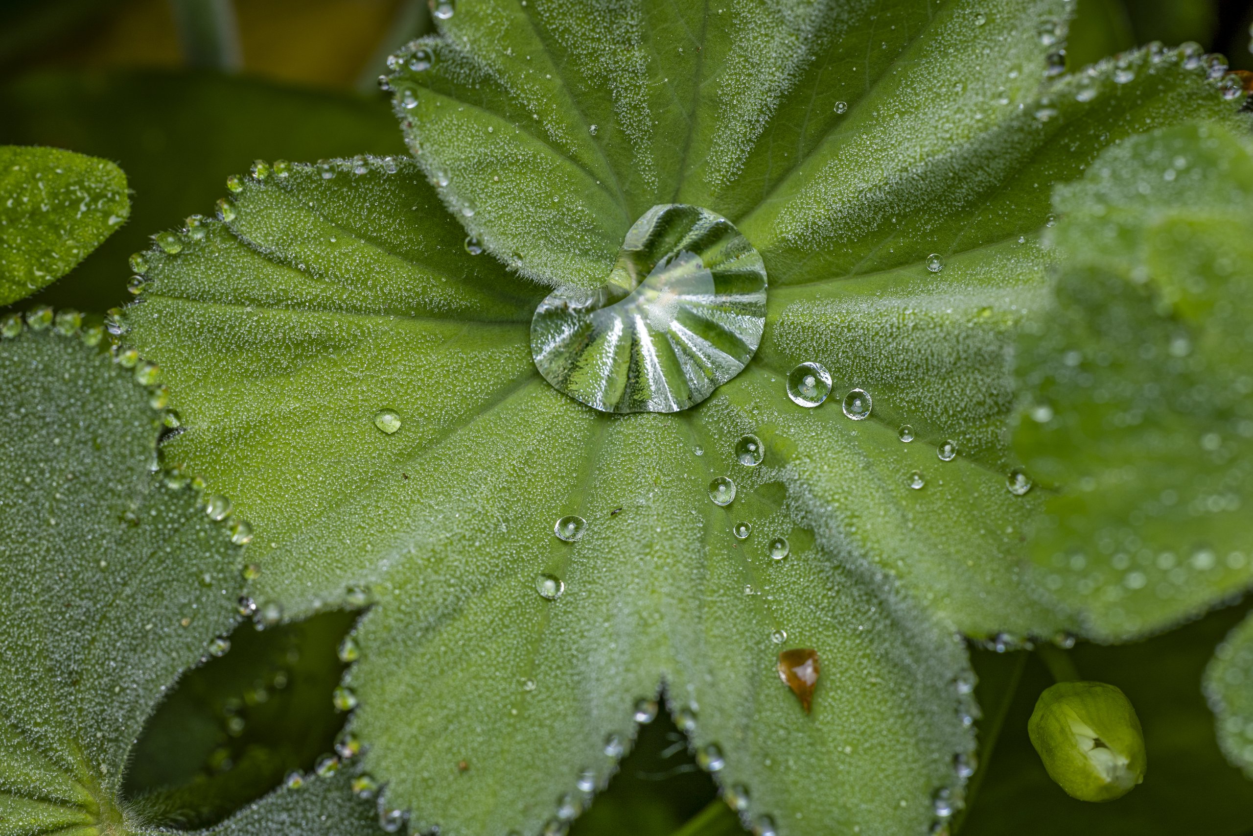 Wassertropfen auf einem Frauenmantelblatt, eingefangen im morgendlichen Licht. Die perfekten Tropfen auf der samtigen Blattoberfläche erzeugen ein zauberhaftes Naturschauspiel.